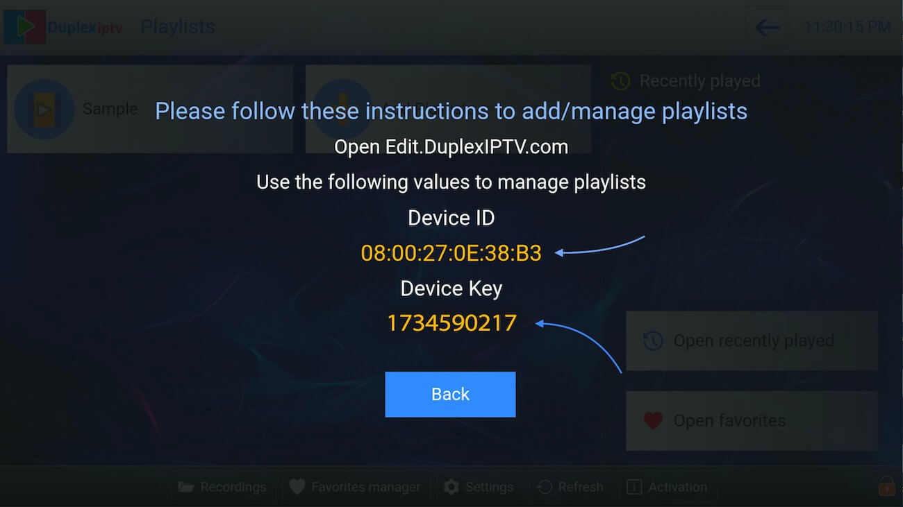 1- Ouvrir l’application DUPLEX IPTV. (Notez bien les deux codes “device ID” et “Device key”)